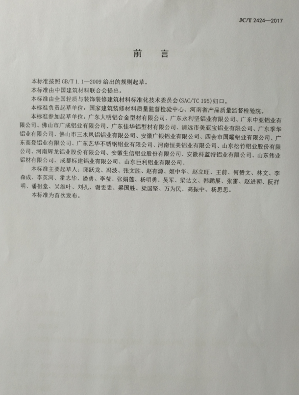 恭喜山东巨利铝业有限公司成为建材行业标准 JC/T 2424-2017 起草制定单位
